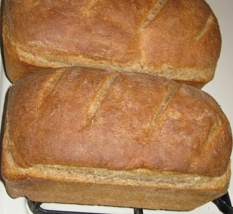 Let the loaves sit for another 20-30 minutes to let them rise. Then cut slits in the top (to let the steam escape when baking), and bake for about 35 minutes in a 425 degree oven (or 40 minutes at 400 or an hour at 350). Take out of the oven and remove from the pan. Cool, covered with a dry towel, for 15 minutes (or as long as you can wait), and enjoy.