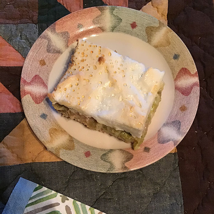 Once we’d eaten the pie, we were in the mood for another rhubarb dessert. This is Rhubarb Angel, which has a butter/flour/sugar bottom crust with a merringue and a custardy filling: 3 egg yolks, cream (though I used buttermilk), 1 C sugar. You can tell that this was made with the lighter variety. Besides pie, this was one of our favorite rhubarb desserts when I was growing up, but the most common way for us to eat rhubarb was always as a sauce, which can be put on cereal or eaten by itself at breakfast or poured over ice cream for dessert.