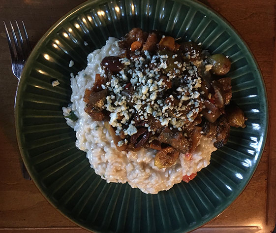 While half the figs, eggplant, garlic, mushrooms, squash, and peppers sautéed, first on medium high and then on medium low, I cooked the risotto according to our usual recipe for 3 people: half an onion sautéed in butter and olive oil, 1 1/3 cup arborio rice, and 6 cups of vegetable broth, added 1/2 cup at a time, simmering until it is absorbed, then another 1/2 cup is added and so on.