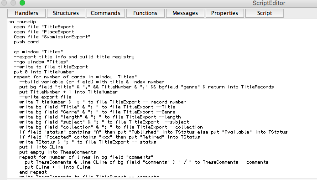 Over the years, I’ve developed a fairly complex submission tracking program using first HyperCard and then SuperCard, as I described in my post “Tracking Submissions.” It works very well, though I know that it is ideosyncratic enough that no one else can probably use it. I have a card for every title and a card for every publisher, and they cross-reference what was sent where, when, and what the response was. I can also run several kinds of reports to see what is in, out, or accepted, for instance. I can use it to keep track of grants, and I even set up an invoicing system and a way to track my expenses and earnings. I’ve been working on this for over 30 years, and added a little at a time for quite awhile, though it’s been awhile since I did any programming in it, until now.
