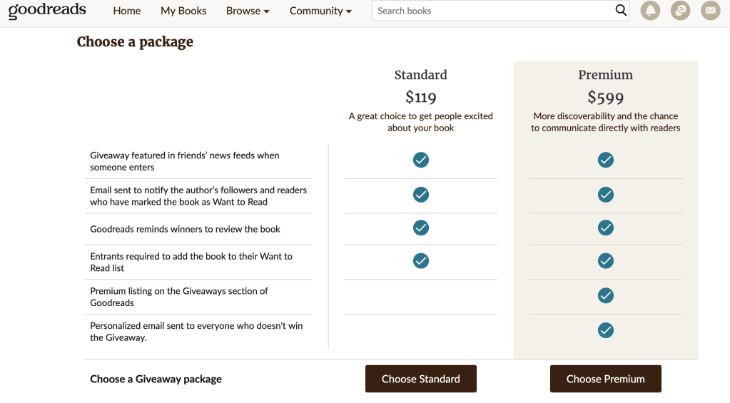 If I were trying to build interest in a blockbuster title, my calculus might have been different. I can even see paying for the premium plan if it were part of a marketing campaign and if my publisher were behind it and willing to give out more copies than I could afford. If this led to more reviews and a greater presence on Goodreads, it might be worth it, especially if my book was the kind of book people care about there. I would want to know that there was an active community of readers who I could reach wiht my investment.