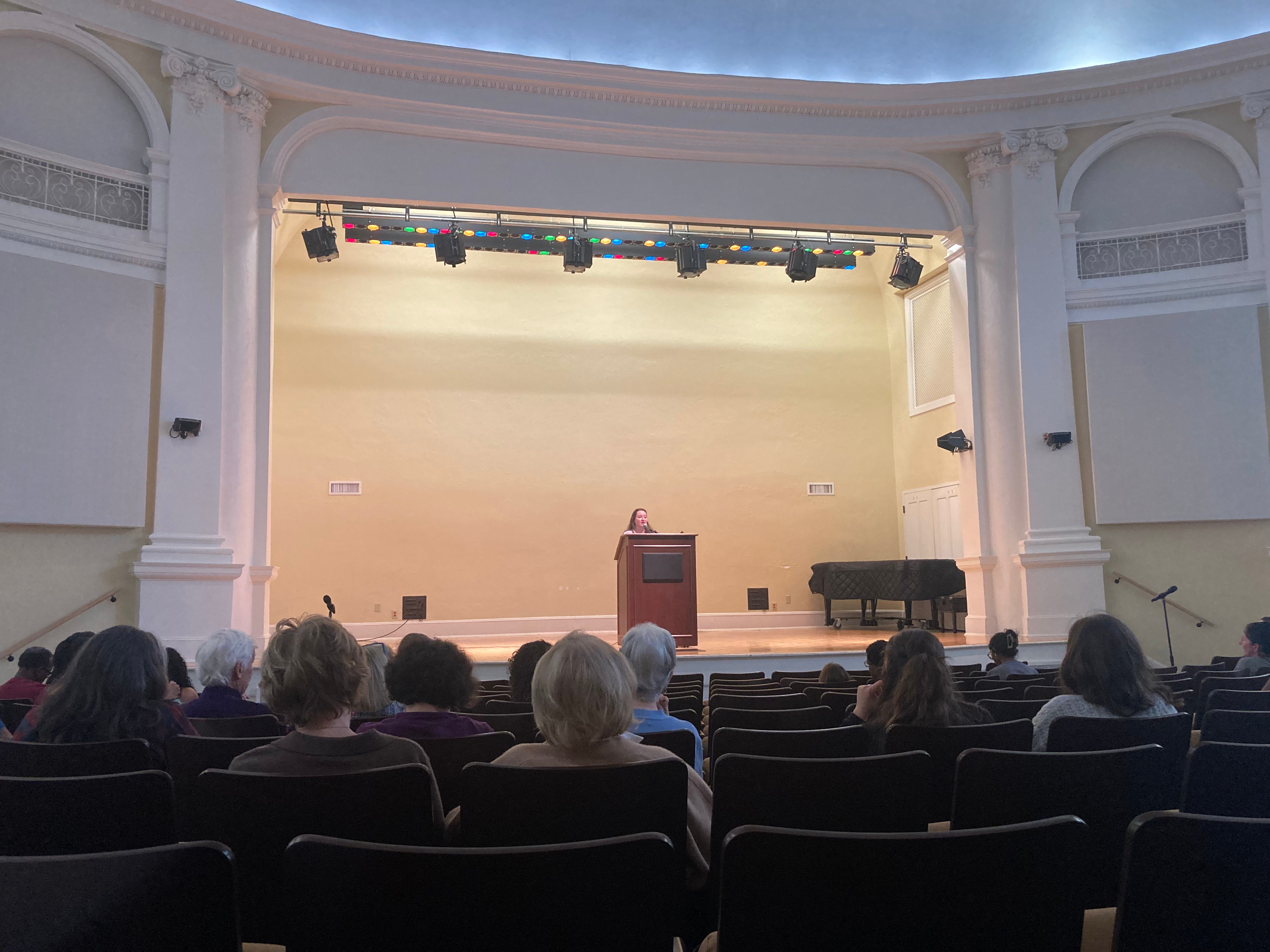 The readings were fabulous, starting with Ashley M. Jones, who took us through her four collections. Ashley is always a delight to host, and she focused on poems about family and heritage in connection with our theme, Secrets and Revelations: A Dark Thread Running Through My Story. In her family’s case, that dark thread has more to do with the history they were part of than any personal dark secrets. Here you see Ashley and me at the book signing table after her keynote. Thanks go my former student Magnolia (Jane) Dill, for offering to take the photograph.