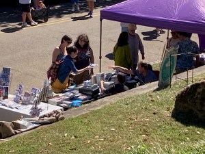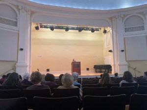 After breakfast we stopped by the bookstore and then headed over to the flea market to have a look around. For an hour or so before the reading, I sat at Lorelei Books’ table and talked to people about Tree Fall with Birdsong. Lorelei’s owner, Kelle, called over a few friends and between them and a few people who wandered by, we rustled up a nice, small crowd for the reading. One draw was that it was indoors in the old courtroom, which was air conditioned. A few people wandered in and out, but several stayed for the full reading and discussion. We talked about the poems, and also about The W’s low-residency MFA program and the Welty Symposium, which I had mentioned in my bio.