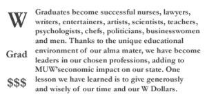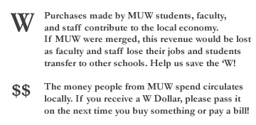 Recently, I’ve been designing money — not real money and not Monopoly Money, but W Dollars to help show the economic impact MUW has on its local community and state. The idea is that any time someone from the W spends money, they should give a W Dollar with their payment: that might be a purchase in a store, gas station, or restaurant, or it might be for paying the rent or other bills. Students, faculty, and staff live in the area and we spend money here. We also save money, and could include a W Dollar when we make a deposit or put a W Dollar in the offering plate at Church or when we make a donation to a charity. If MUW is merged, there may be a campus in Columbus, but many of the students and faculty will have to move — either to Starkville or even further away, depending on what happens to our jobs or where we decide to go to school. These dollars won’t be spent in our community if we aren’t here.